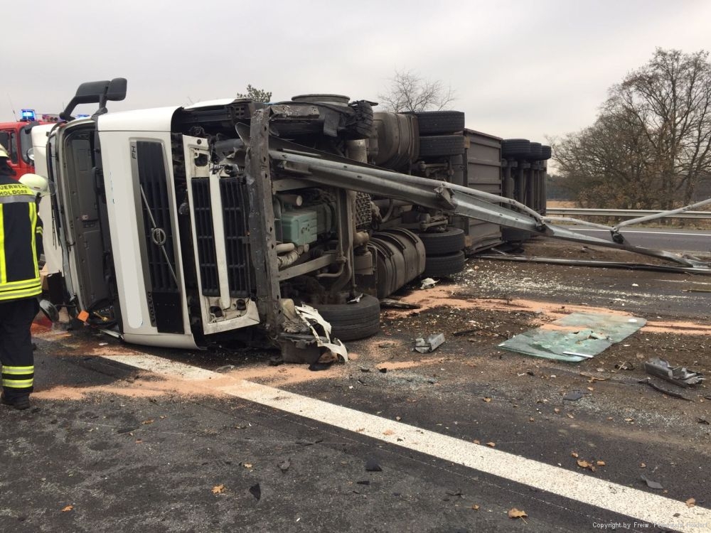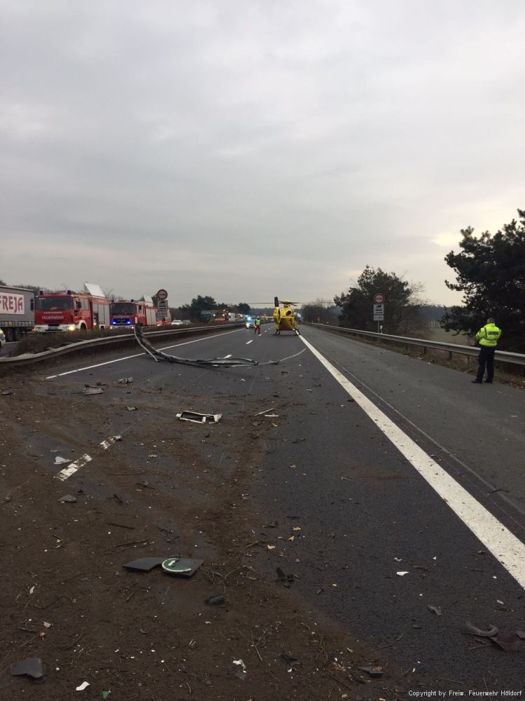 Am 30.11.2016 wurden die Feuerwehr Feuerwehr Holdorf gegen 13:06 Uhr zu einem Verkehrsunfall mit einer eingeklemmten Person gerufen. Nach der ersten Erkundung konnte eine erste Entwarnung gegeben werden, der LKW-Fahrer war bereits von Ersthelfern befreit worden. Da der LKW in Fahrtrichtung Bremen unterwegs war und die Mittelleitplanke komplett durchbrach, war ebenfalls die freiw. Feuerwehr Neuenkirchen mitalarmiert. Die Arbeit der Feuerwehren beschränkte sich aber auf das Aufnehmen der auslaufenden Betriebsstoffe sowie die Absicherung der Einsatzstelle. Der LKW-Fahrer wurde bei dem Unfall schwer verletzt mit einem Rettungshubschrauber einem Krankenhaus zugeführt.