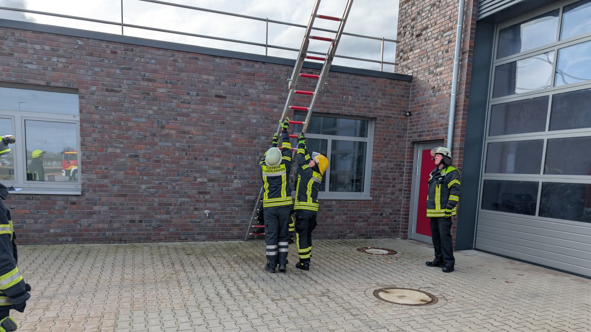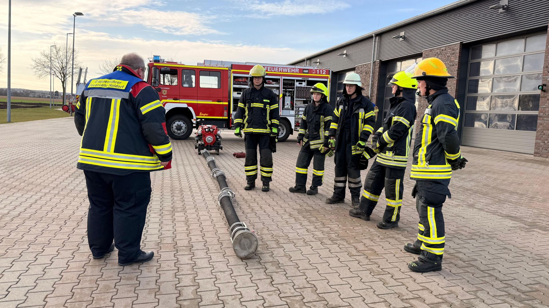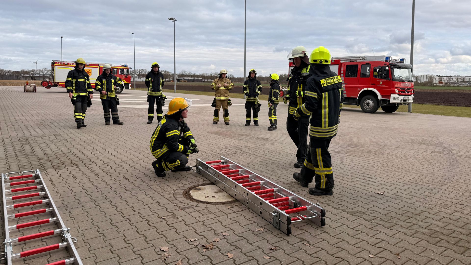 Der Startschuss fiel am Morgen in Holdorf. Dort wurden die ersten Inhalte erarbeitet, bevor es im weiteren Verlauf nach Steinfeld ging. Im Feuerwehrhaus Steinfeld gab es Mittags eine kurze Stärkung – ein Snack, ein paar Gespräche und der schnelle Blick auf den weiteren Ablauf. Dann ging es mit frischer Energie in den nächsten Abschnitt: praktische Übungen, bei denen jeder Handgriff sitzen musste. Im Mittelpunkt standen mehrere Ausbildungsinhalte, besonders jedoch die Wasserentnahme aus offenem Gewässer, der Aufbau eines Löschangriffs sowie Leitern und weitere Geräte aus dem täglichen Einsatzspektrum. Vom sauberen, sicheren Arbeiten an der Entnahmestelle über die strukturierte Aufgabenverteilung beim Löschangriff bis hin zum richtigen Umgang mit Leitern: Es wurde geübt, abgestimmt, korrigiert – und vor allem gemeinsam gelernt.